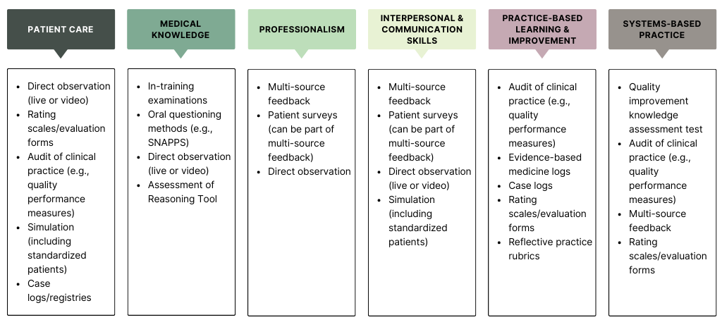 The Accreditation Council for Graduate Medical Education (ACGME) in 2020 published a comprehensive document about competencies and the AGCME’s next steps in competency-based education, namely, milestones. (5) The table below lists the six competencies that have been developed and rolled out by the ACGME. Note that the competencies are also accompanied by methods to assess them – remember these are the outcomes the learners are supposed to acquire (learn), not simply have been taught.